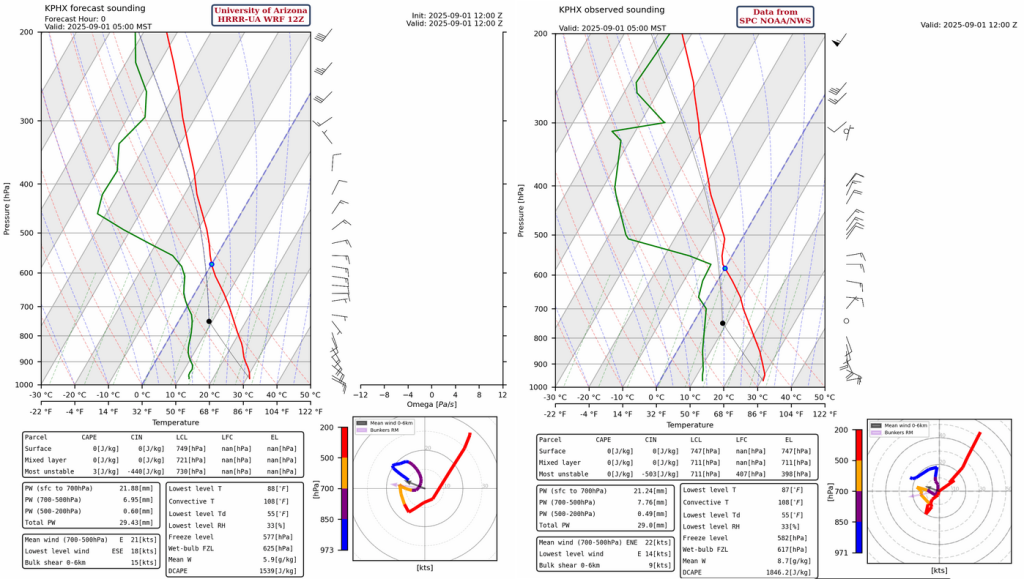 Both the observed sounding at Phoenix from 5am and the HRRR-UA WRF 12Z initialization are similar with an increase in precipitable water of 0.20 inches (5mm) compared to yesterday. The forecast initialization has the low-level winds a little too strong versus the observed sounding. With the convective temperature of 108°F in these soundings and forecast high of 105°F, surface-based convection is unlikely. Storms may move in off the Mogollon Rim in the evening due to the northeast wind flow.