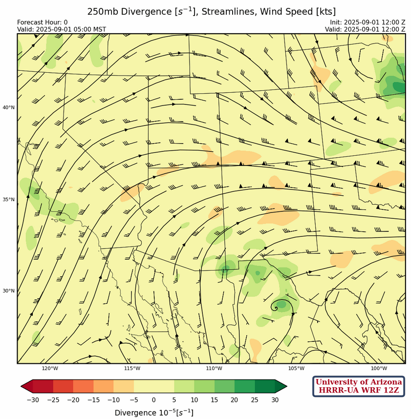 At 250mb, the center of the ridge remains in southern Texas with the ridge axis moving north. This pattern means southern Arizona is south of the ridge with southerly to southwesterly winds.