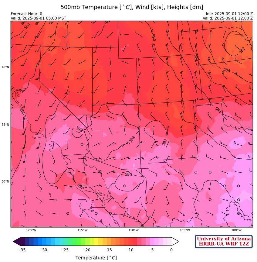 The ridge is over the Mogollon Rim at 500mb, with the ridge axis extending north to Idaho. The southern half of Arizona has easterly winds.