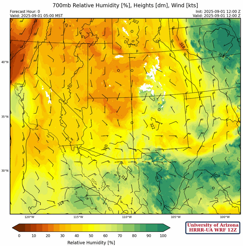 At 700mb, southern Arizona is still has easterly winds aloft, so any storms that form will move westward. The circulation around the high pressure north of the White Mountains will bring dry air into the region from Colorado and Wyoming though the week.