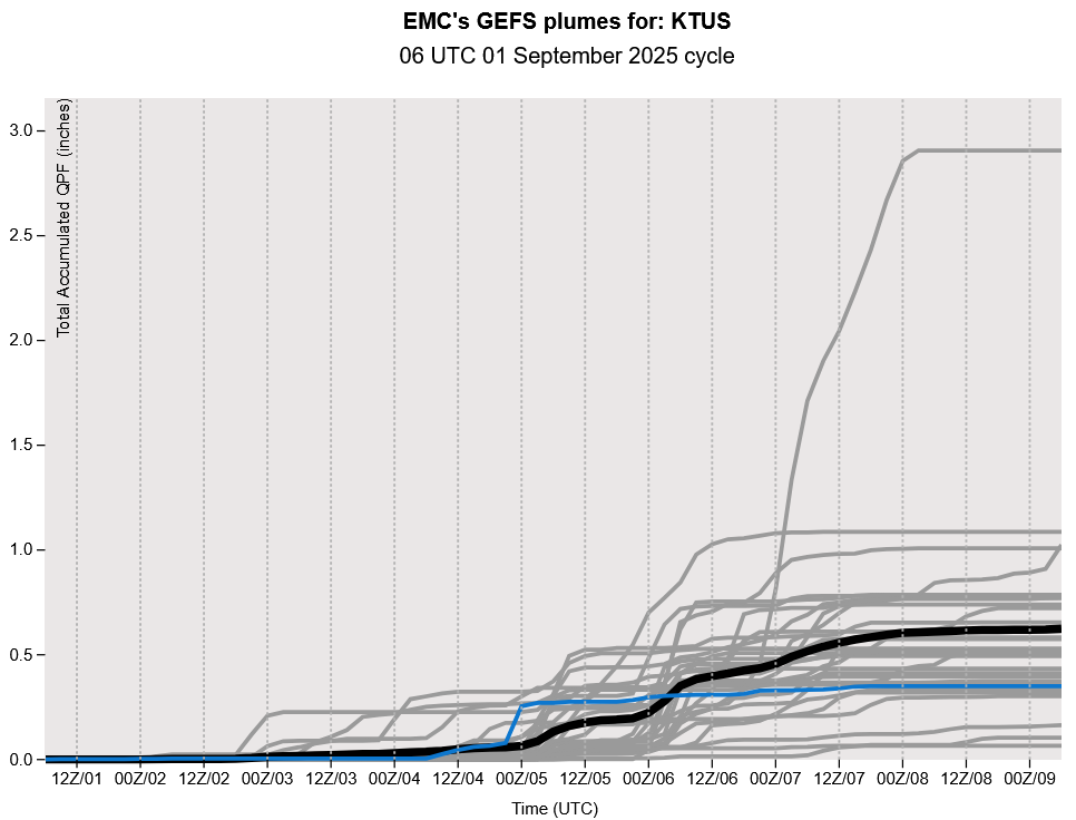 The GEFS plume forecast for Tuscon indicates that there’s one last shot at monsoon storms from September 4th through the 7th, as a tropical system moving to the Baja Peninsula pushes one last shot of moisture over the Arizona. The 3 inches of rain predicted by one ensemble member forecast is bogus; we will likely see a half inch or so.