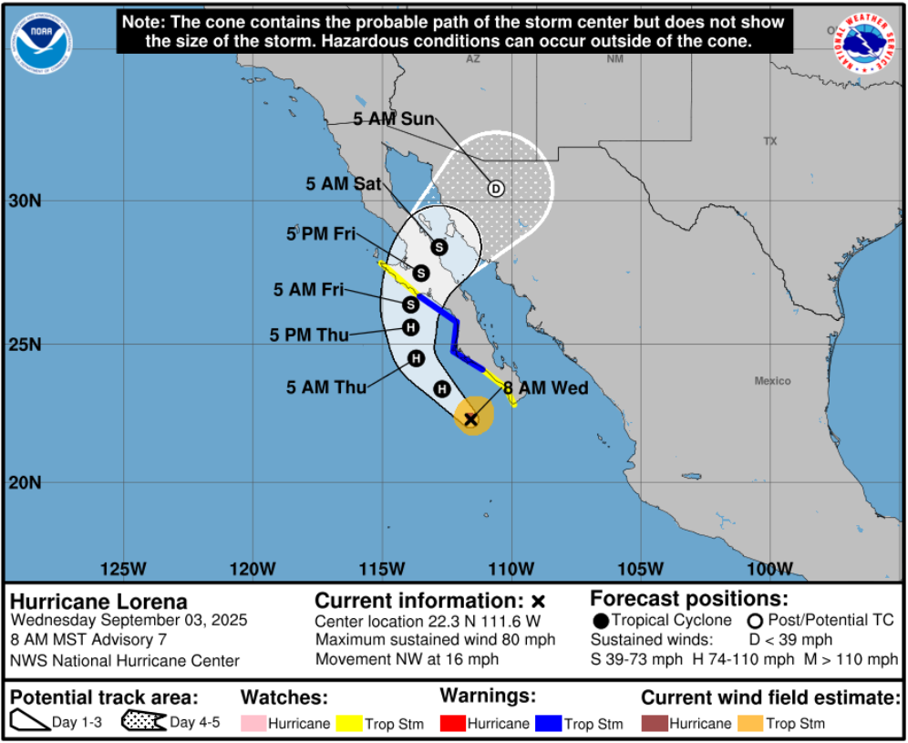 The National Hurricane Center forecast track for Hurricane Lorena is below.