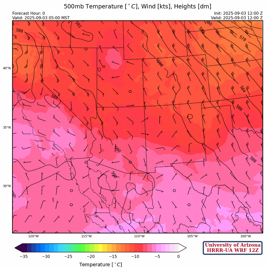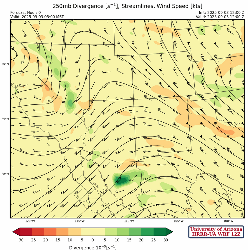 At 250mb, the high-pressure ridge is in central Mexico with a trough in eastern California. Southern Arizona will be in weak upper-level divergence by this afternoon.