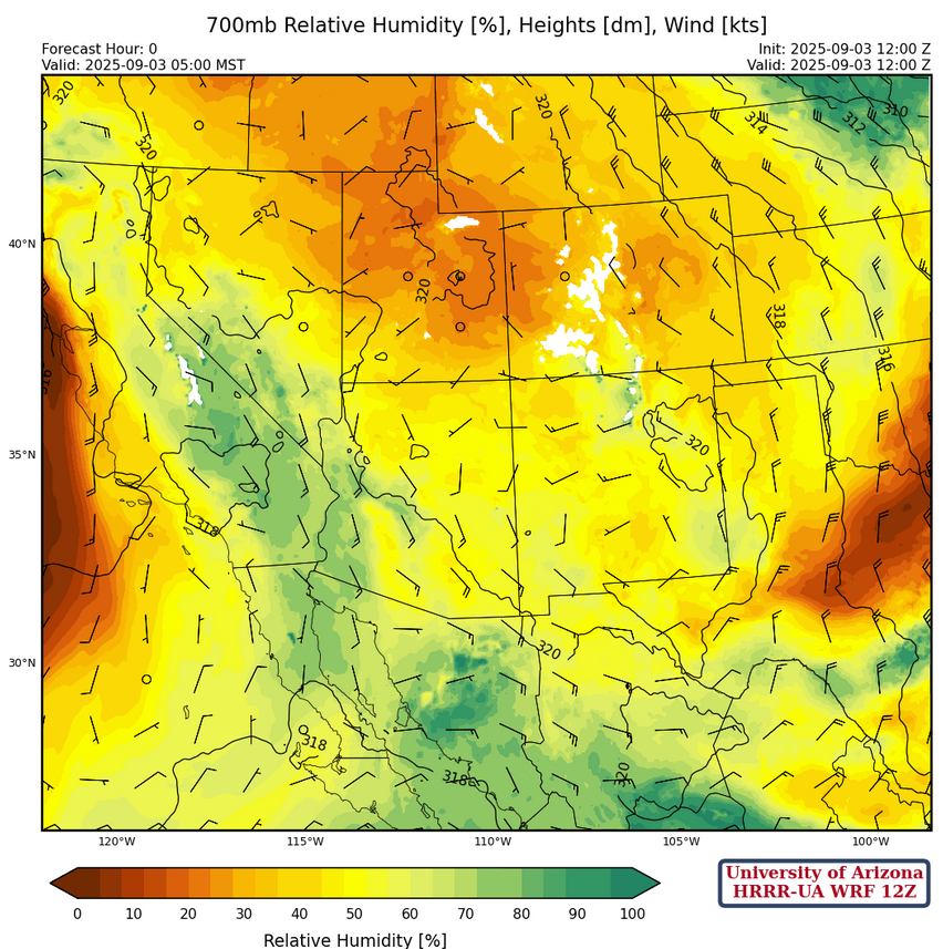 At 700mb, moisture extends from north/central California southeast to northwest Mexico. The winds in southeast Arizona are expected to weaken during the day and the drying seen yesterday from Tucson to Phoenix will lessen today.