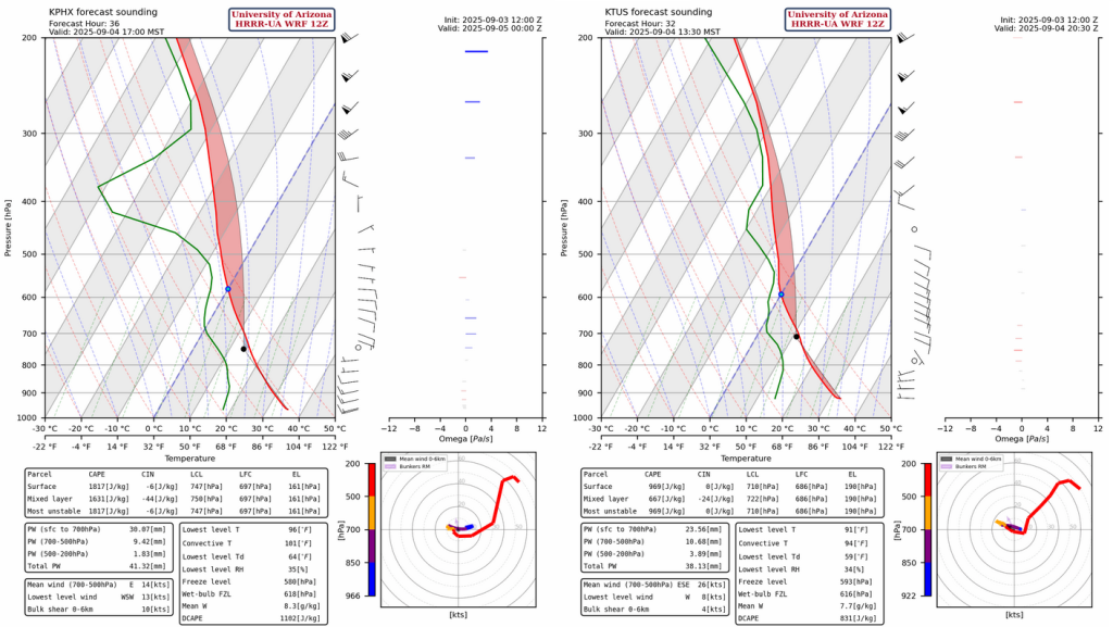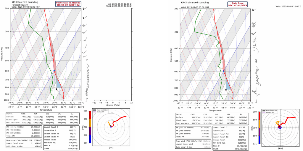 The observed sounding at Phoenix from 5am and the HRRR-UA WRF 12Z model initialization are very similar today. The tropopause is at 48,000 feet (250mb), so thunderstorms would be able to grow to that level with the strongest updrafts (this will be more impactful for Thursday more than today, as there’s an inversion near Tucson and not enough Convective Available Potential Energy (CAPE) in Phoenix, read more on this later).