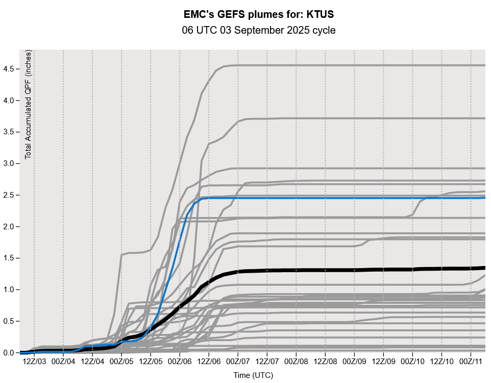 The GEFS plume forecasts below show the wide range of rainfall predicted for Tucson. The ensemble mean is 1.32 inches which is very close to the ECMWF forecast.