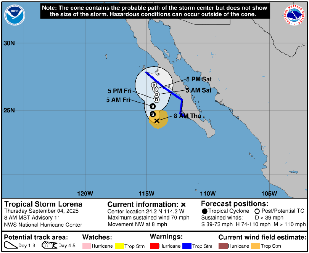 The latest forecast from the National Hurricane Center (NHC) shows Tropical Storm Lorena weakening and dissipating off the west coast of the Baja Peninsula. It’s a stark difference from yesterday’s cone. The text below is from the NHC discussion: