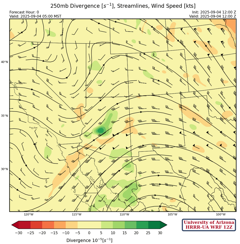 At 250mb, a trough is moving into Arizona today providing some divergence aloft over southeast of the state as it moves east.